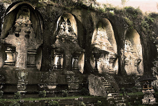 dinding Gunung Kawi, Tampaksiring. Kebo Iwa yang memahat dinding gunung